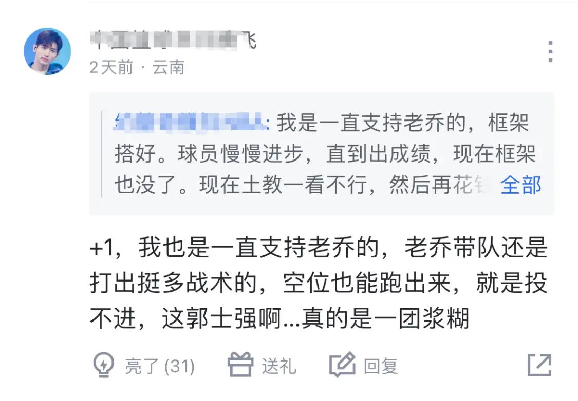 乔尔杰维奇带队也确实输球,但可以明显地看到球队战术的运转,球员当时的跑位也相当积极,只是空位出来投不进,高低位传球被断,这是球员能力有问题,执行不了战术罢了。可现在郭士强上任,不仅球员能力问题更大了,战术也是一坨浆糊,主打一个乱套。