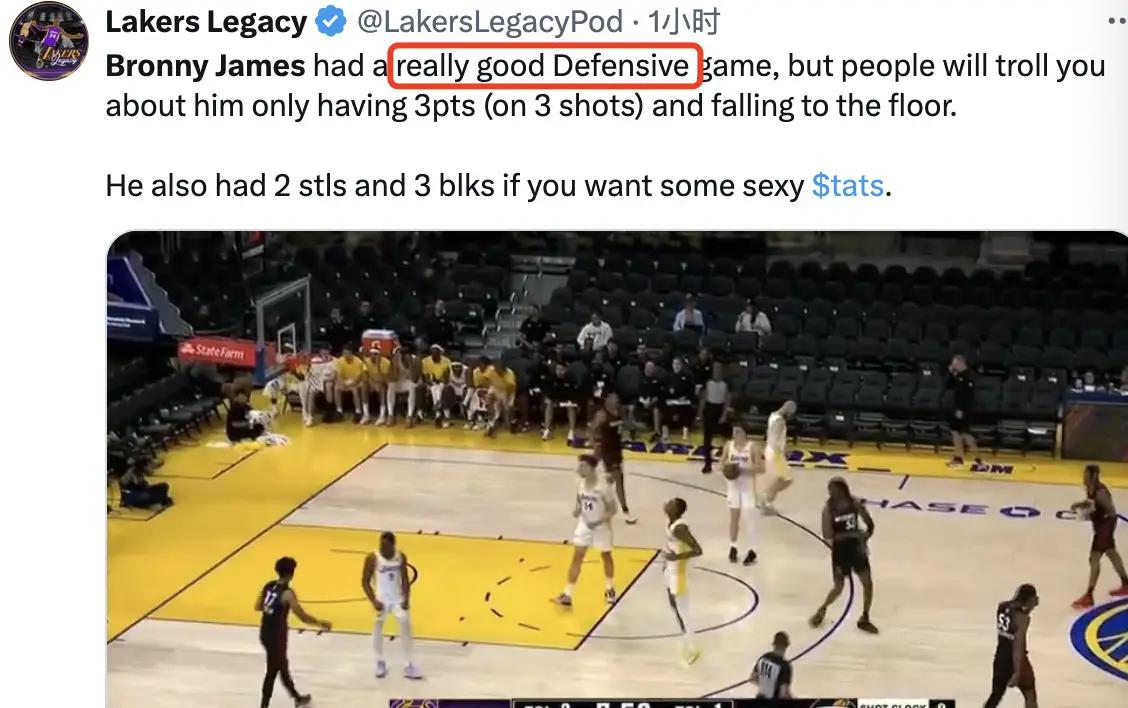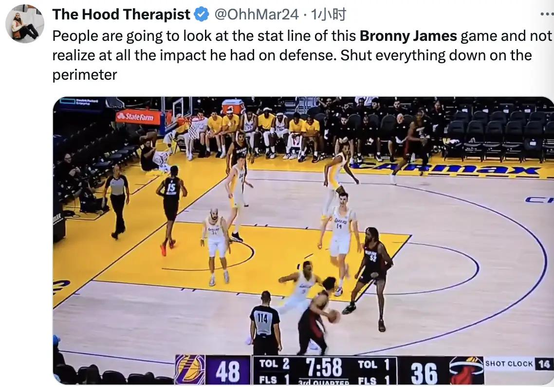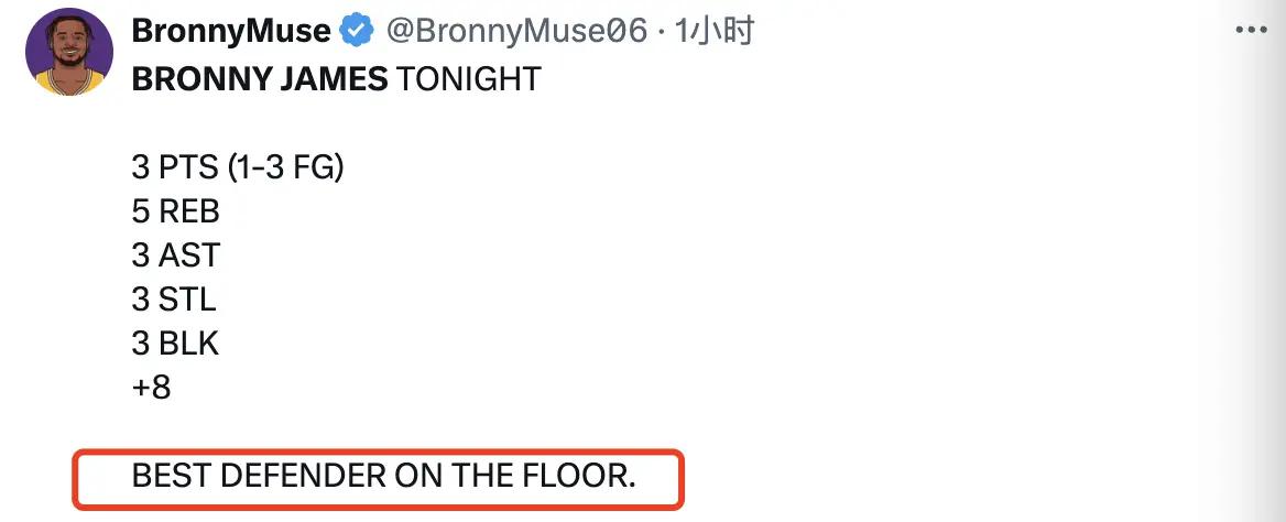对于布朗尼的防守表现,有美媒甚至赞誉他是湖人全队最佳。其实,老詹也力挺儿子要做好防守,找准定位。