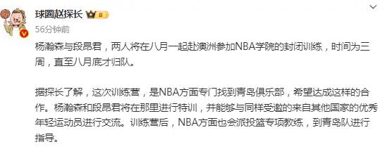 北京时间7月12日,根据媒体人赵探长透露,杨瀚森与段昂君,两人将在八月一起赴澳洲参加NBA学院的封闭训练,时间为三周,直至八月底才归队。