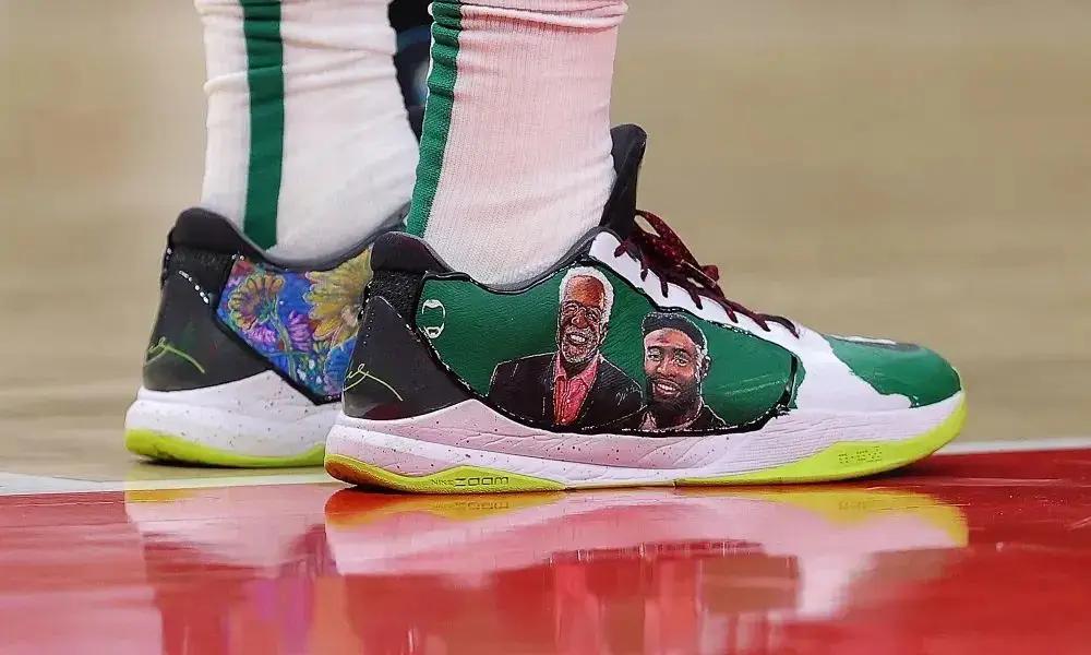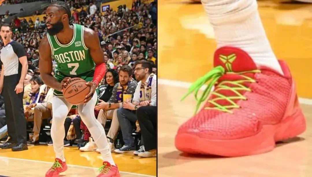 去年的圣诞大战,杰伦更是直接上脚了一双科比6代反转青蜂侠的“撕标”版本球鞋,此后更是屡试不爽。
