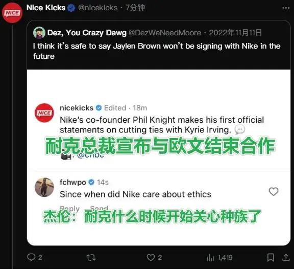 他和耐克的恩怨要追溯到2022年底,耐克因“反犹事件”和欧文解约。杰伦在自己的社媒上声援欧文并声讨耐克:“耐克什么时候开始关心种族问题了。”