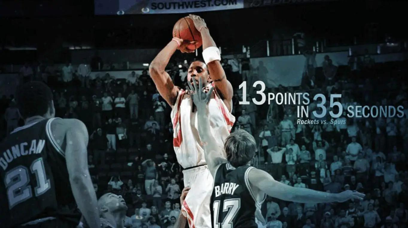 比赛只剩下35秒,球队还落后8分,大多数人都觉得胜负已定,准备离场了。但就在这时,麦迪站了出来,他就像是拥有超能力一样,连续投进了四个三分球,其中一个还是打四分!简直让人瞠目结舌!