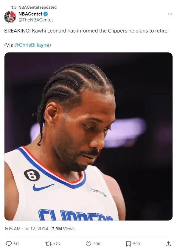 突发新闻:伦纳德向快船方面通知自己准备退役。