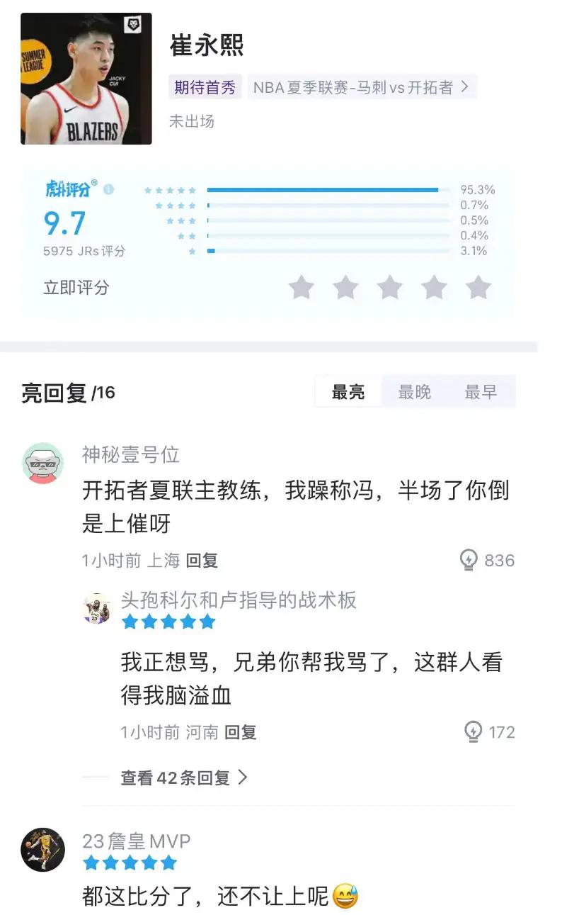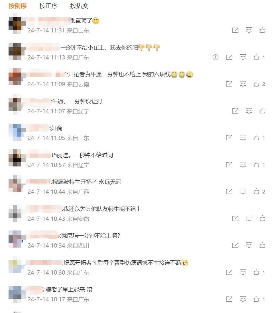 不光如此,还有球迷指出:“先不谈小崔上不上,你们这几个人打的又菜又臭又无聊的,别人来看小崔看不到就算了,还看这么个草台班子打球,纯纯的坐牢。”、“你以为关注你是来看你发动态的?赶紧解散,烂队!”、“烂泥扶不上墙!垃圾时间都不愿意给小崔上场机会!”、“其他人打得像**都不给小崔上场时间?”、“祝你们下赛季进不去季后赛。这泼天的流量接不住,太让球迷失望了。”、“上崔永熙早赢了,一群水货开拓者,三不沾真牛逼。”
