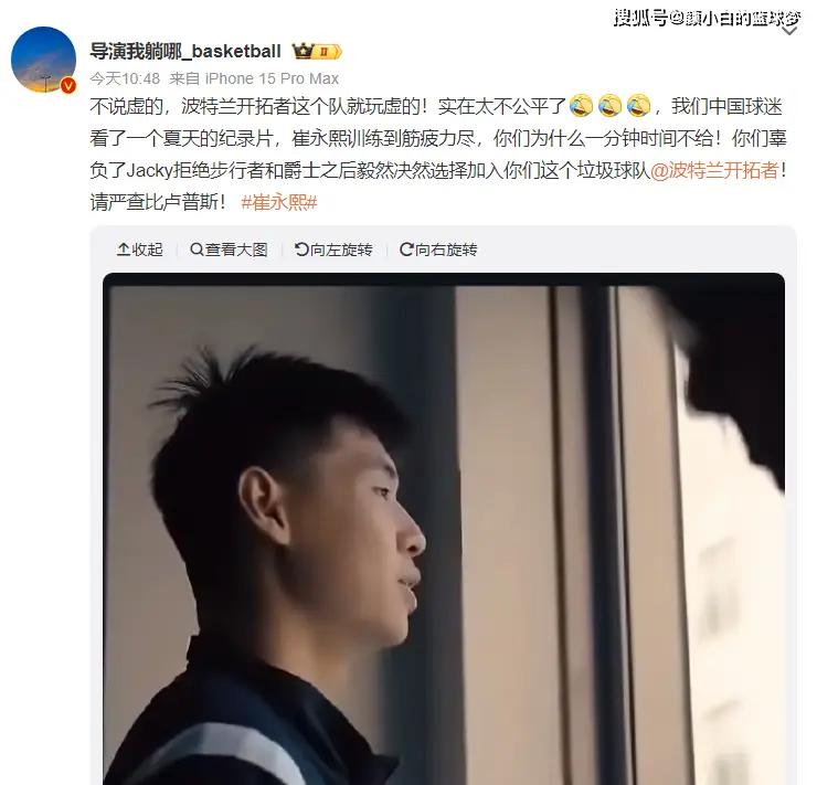 大V导演我躺哪冷嘲热讽:中国球迷看了一个夏天的纪录片,崔永熙训练到筋疲力尽你一分钟都不给,你们辜负了小崔拒绝步行者、爵士,开拓者你们这个垃圾球队,请严查比卢普斯。