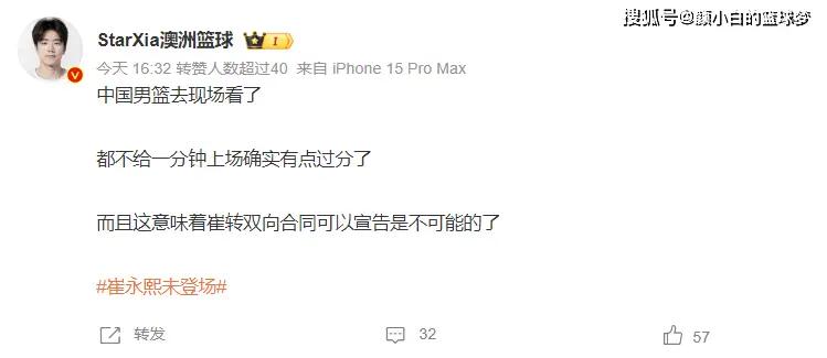 大V澳洲篮球写道:中国男篮去现场为崔永熙捧场,结果还是一分钟不给崔永熙,这也意味着崔永熙根本不可能转为双向。