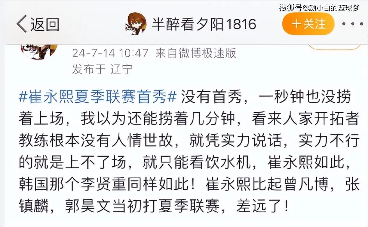 还有大V写道:有实力能努力训练就可以打动教练,张镇麟、曾凡博都可以在夏联登场,为什么到崔永熙就不给上?
