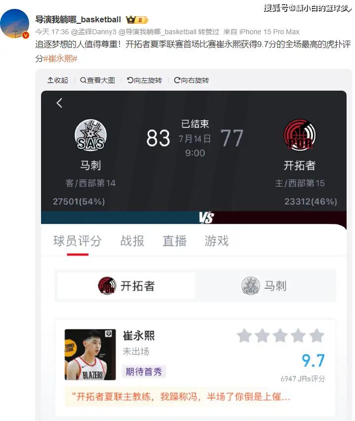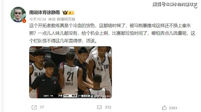 崔永熙在夏联首秀0分钟引发全国篮球圈的热议,徐静雨直言开拓者夏联教练是一个狠角色,已经进入垃圾时间都不给崔永熙上,哪怕要点流量。(实际上就是NBA根本不在乎中国市场)