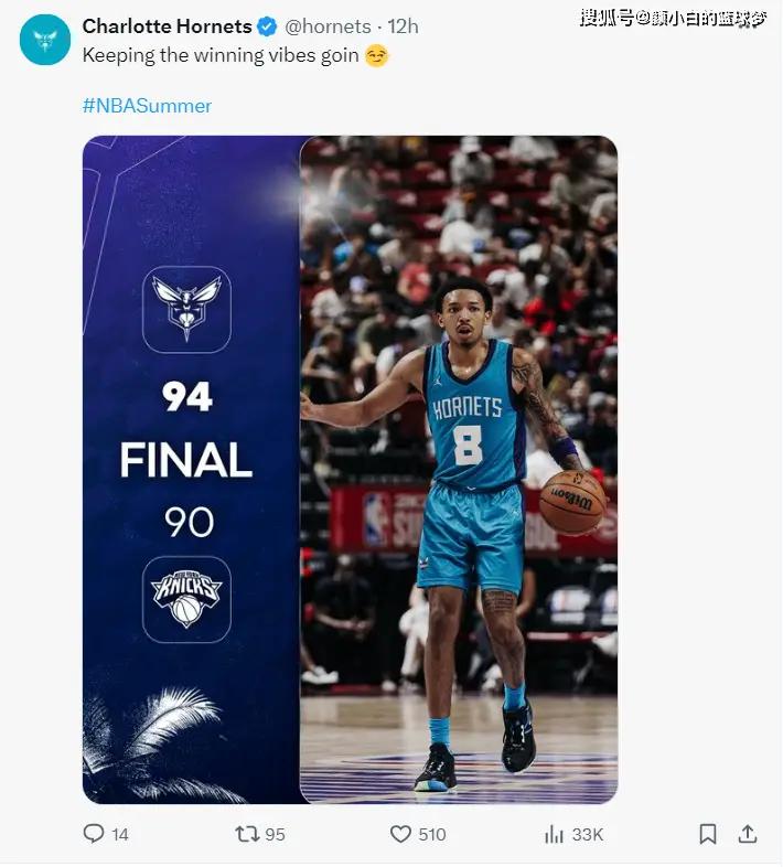 北京时间7月14日,NBA夏联,夏洛特黄蜂94-90险胜纽约尼克斯,这场比赛黄蜂去年的榜眼布兰登-米勒登场了,首节黄蜂就领先尼克斯11分之多,后面两节尼克斯缩小到4分,末节两队鏖战至最后一刻,黄蜂依靠米勒、史密斯的发挥拿下胜利。