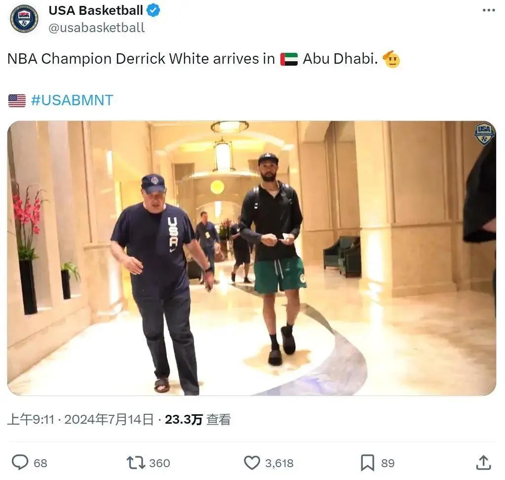 北京时间7月14日,美国篮协官方宣布:凯尔特人后卫德里克-怀特,抵达阿联酋的阿布扎比,跟美国男篮会合,他将随队征战7月26日开幕的巴黎奥运会。距离奥运会只剩11天,如果没有伤病问题,美国男篮的名单不会再有变动了。