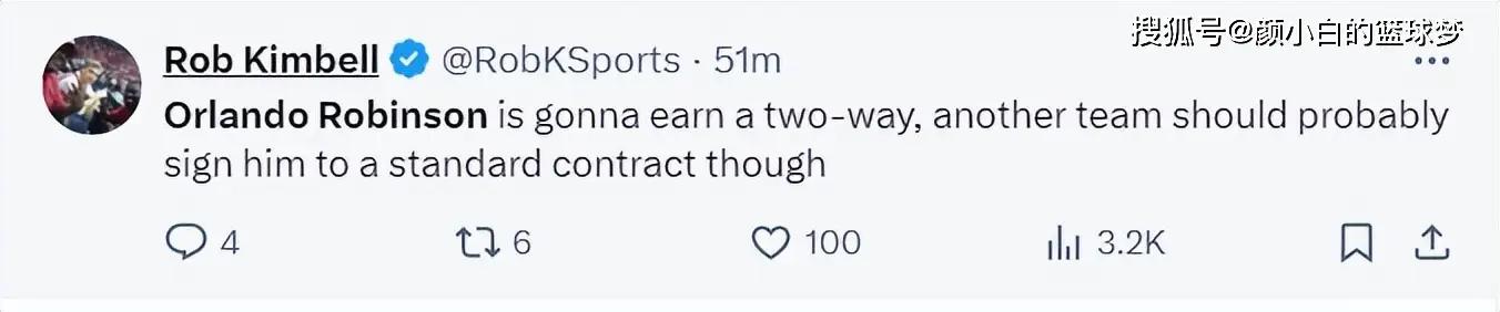 火箭队记罗伯-金贝尔赛后写道:他会获得火箭最后一个双向合同,不过已经有球队在考虑给他一份NBA标准合同。