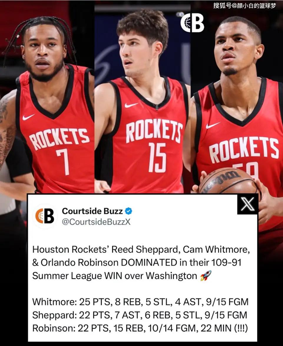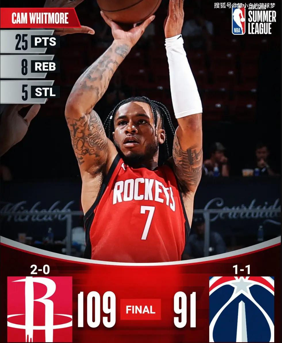 北京时间7月15日,NBA夏联,休斯顿火箭队109-91大胜华盛顿奇才拿到二连胜。这场比赛火箭首节领先6分,半场拉开到15分,第三节奇才好不容易缩小了6分的差距,末节火箭开场一波流直接拉开到20分以上。