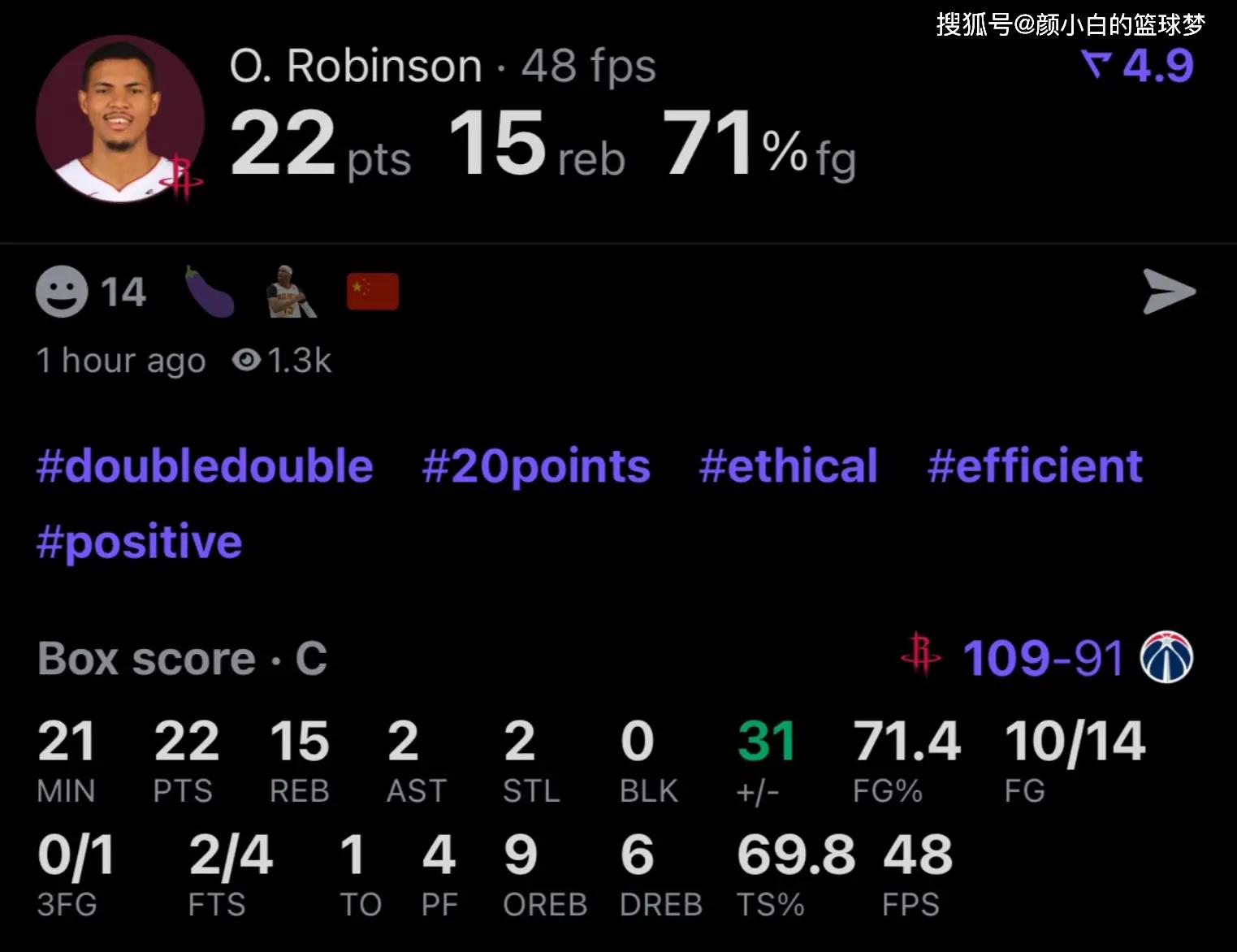 此役对阵奇才的榜眼萨尔,他21分钟,14中10,罚球4中2,拿到22分15篮板2助攻2抢断,命中率71.4%,正负值+31,更为恐怖的是他在萨尔头上抢了9个前场篮板,萨尔全场比赛14中4拿8+4而已。
