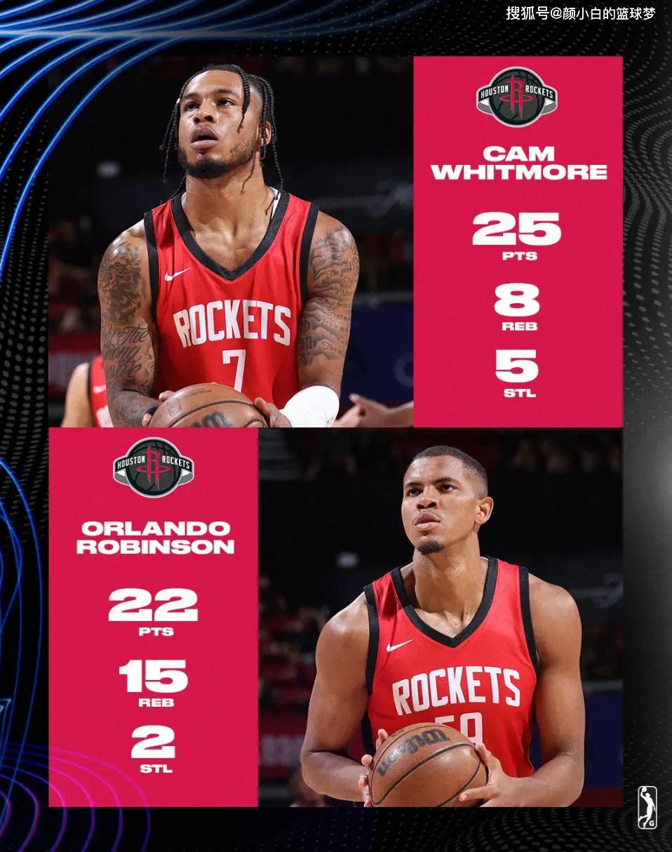 火箭赢球的三大功臣:谢泼德22分7助攻6篮板5抢断(15中9);惠特莫尔25分8篮板4助攻5抢断2盖帽(15中9);奥兰多-罗宾逊22分15篮板(22分钟14中10)。