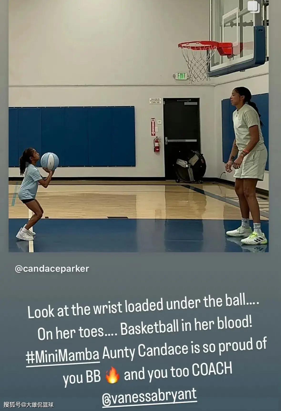 “看看手腕下装着的球...在她的脚趾上...篮球在她的血液里!迷你曼巴,坎迪斯阿姨为你感到骄傲BB!你也是凡妮莎布莱恩特的教练。”