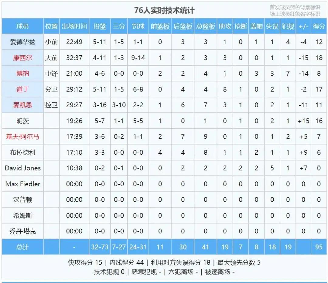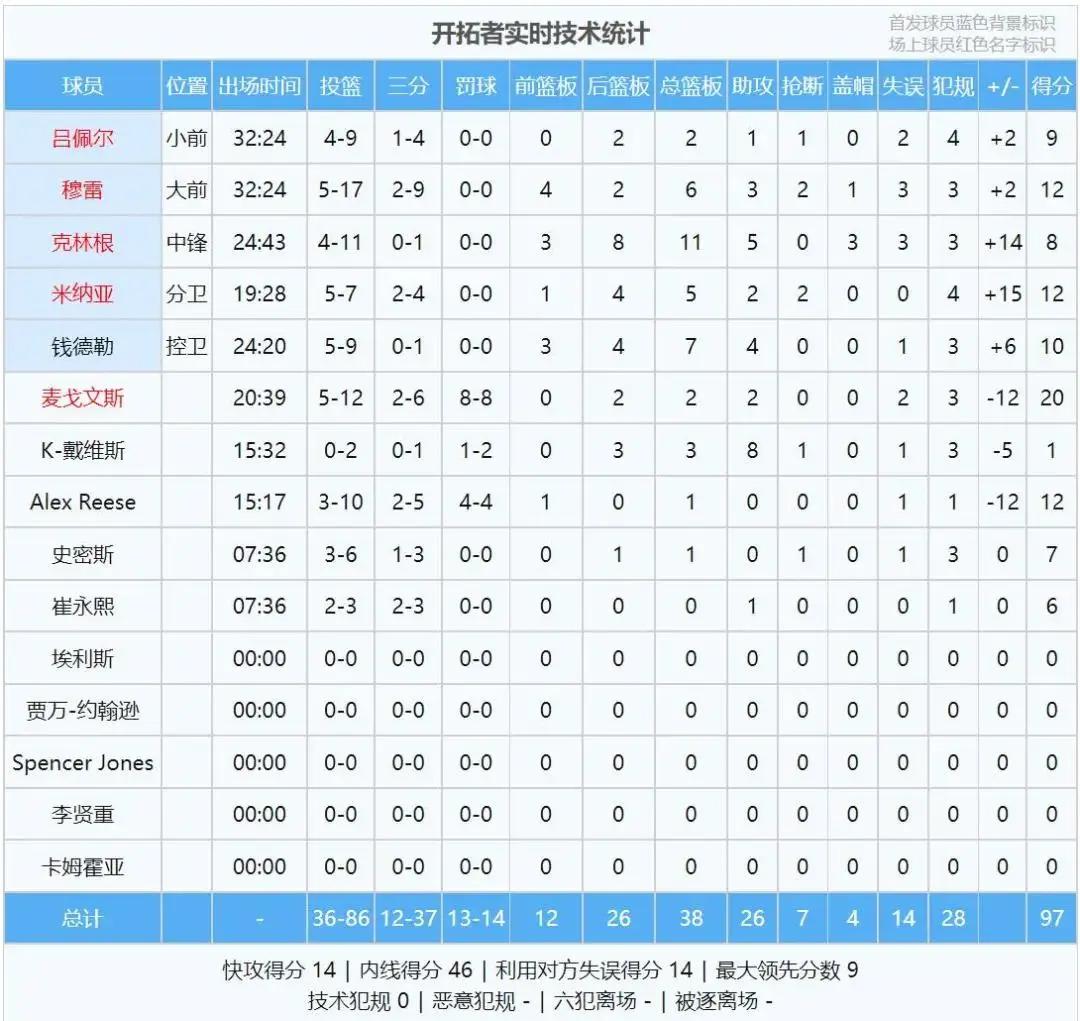 全场结束,开拓者97-95险胜76人。开拓者麦戈文斯20分2板2助,米纳亚12分5板2助,钱德勒10分7板4助,克林根8分11板5助。崔永熙仅出战7分36秒,三分3中2,砍下6分1助攻,另有1次犯规。下半场几乎摸不到球,可惜了。