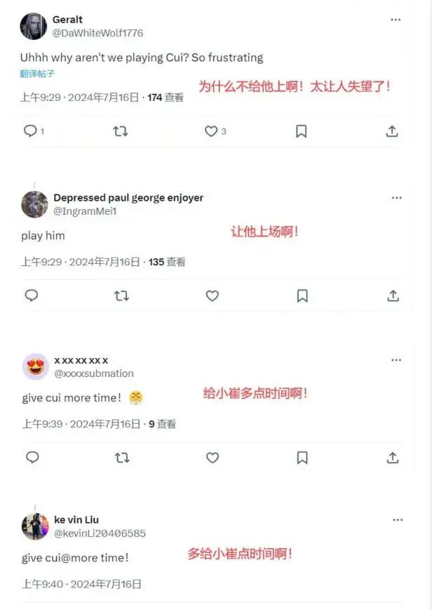 “为什么不给崔上场?太让人失望了”