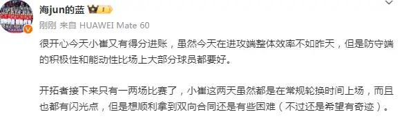 另外一个媒体人“海JUN的蓝”发文说道:很开心今天小崔又有得分进账,虽然今天在进攻端整体效率不如昨天,但是防守端的积极性和能动性比场上大部分球员都要好。