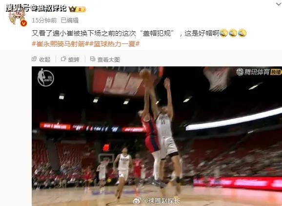 媒体人赵探长发文:又看了遍小崔被换下场之前的这次“盖帽犯规”,这是好帽啊