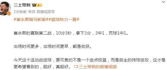 媒体人三土带刺发文说道:出场时间更多,出场时间更早,都是收获。