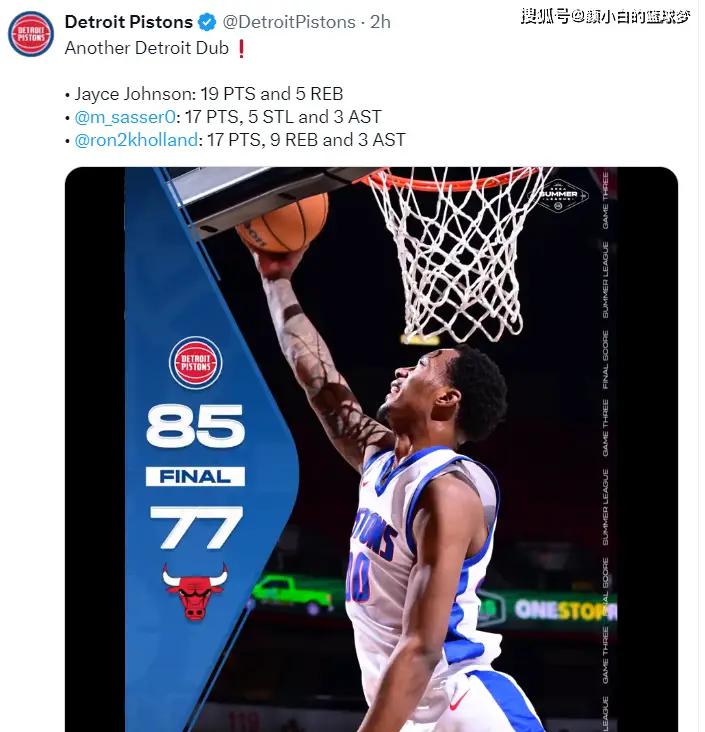 北京时间7月17日,NBA夏季联赛,底特律活塞85-77击败芝加哥公牛拿下二连胜。这场比赛活塞完成了14分大逆转,首节落后14分的情况下次节缩小到5分,第三节打完缩小到1分,末节直接一波23-13带走比赛。