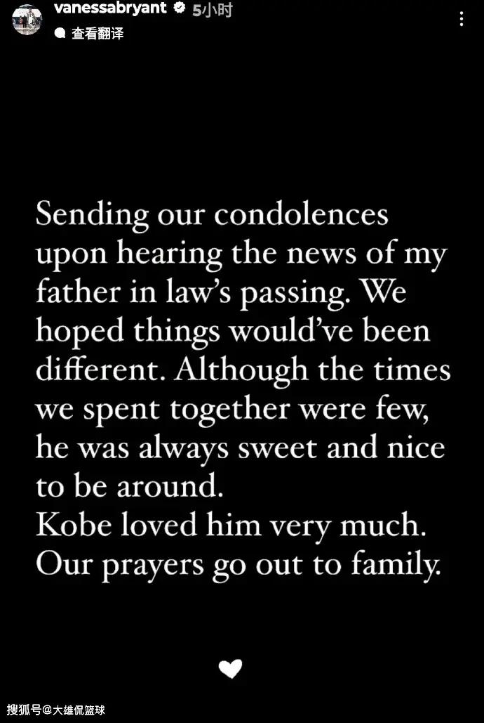 瓦妮莎发文表示“听到我岳父去世的消息,向他表示哀悼,我们希望事情会有所不同。虽然我们在一起的时间很少,但他总是很可爱,很高兴和他在一起。科比很爱他,我们为这家人祈祷。”