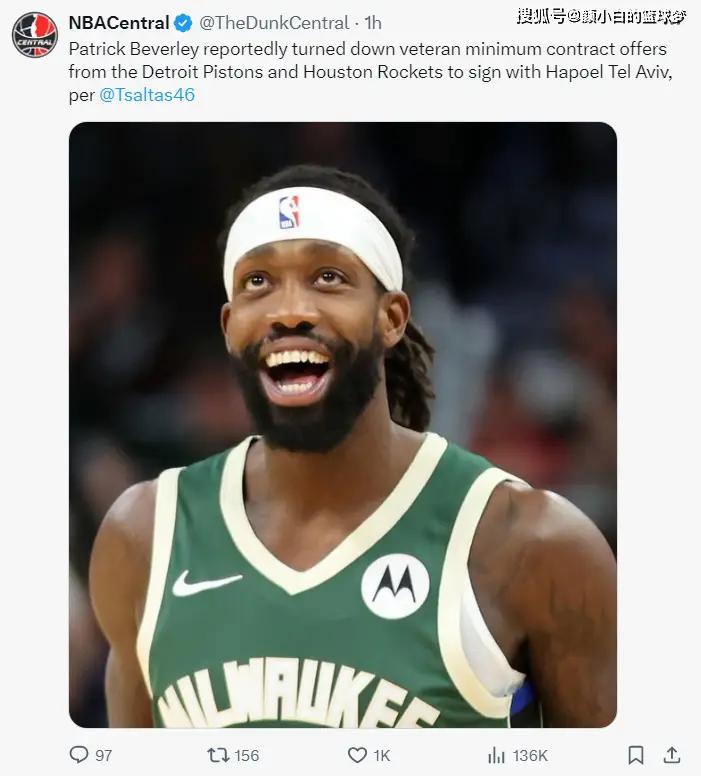 根据NBA记者Christos Tsaltas的报道,贝弗利同时接到了火箭、活塞的电话,他们都愿意用一年330万的老将底薪签约贝弗利,但贝弗利拒绝了这样的报价,他选择了特拉维夫夏普尔。
