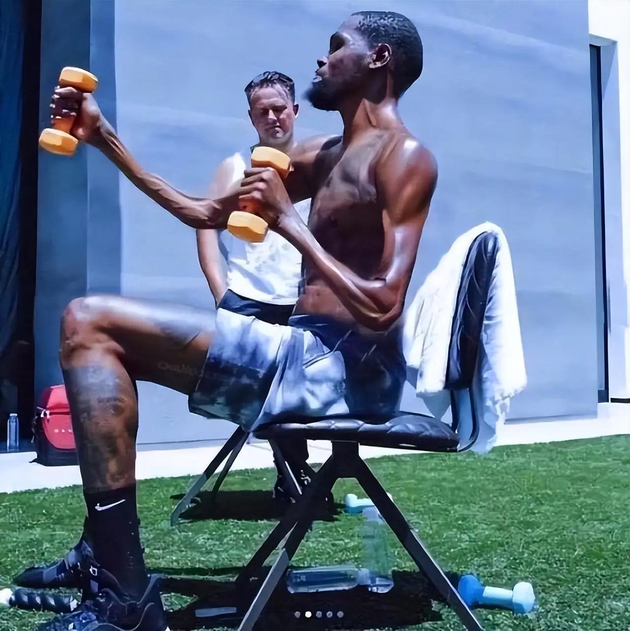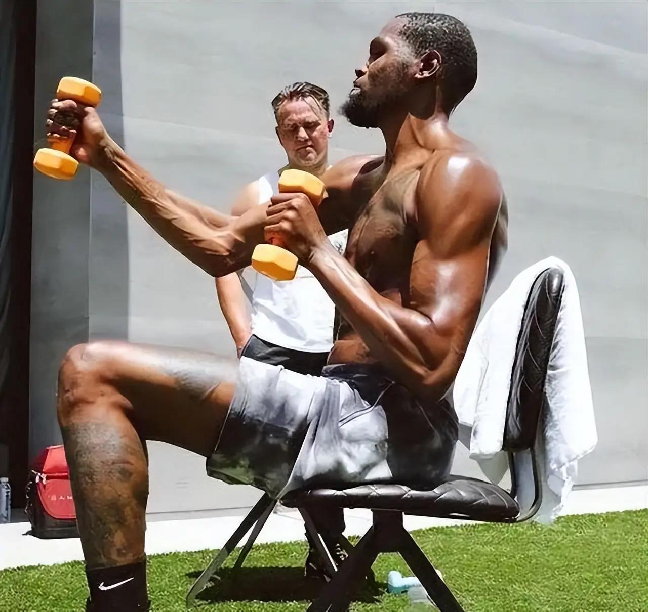 杜兰特给我们的感觉就是包工头的气质,而且他的身高也一直是个谜,加上他的身材并不是十分的壮,所以这张图片的胳膊就感觉像是p过一样,这粗壮的手臂并不是我们熟悉的杜兰特吧,真正的杜兰特应该是下面这幅图的样子吧!
