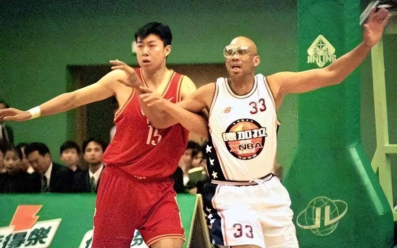 贾巴尔算是NBA的老前辈了,毕竟是作为一个60年代就开始在联盟打球的狠角色了,而且贾巴尔和张伯伦都曾交过手的球员,但是说到王治郅,中国球迷还是很熟悉的,见他打球也就是十多年前的事情,所以看见这张照片就会疑惑,这两人怎么会一起打球也不是一个时代的球员。但事实是在2003年的中国男篮的友谊赛上,56岁的贾巴尔再次披挂上阵,和大郅对位,于是也被拍下来了这张照片。