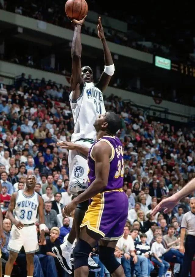 相比于张伯伦和王治郅对位,加内特和魔术师约翰逊对位就显的更离谱了吧。熟悉NBA的球迷都知道,加内特是1995年才进入联盟的,但是约翰逊早在1992年就因为艾滋病退役了,两人怎么可能会对位呢?但事实是1995-96赛季,魔术师曾短暂的复出而且还改打大前锋,才有了这张经典中的经典。
