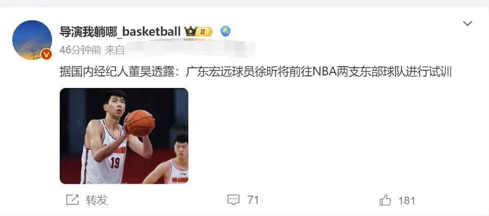 而现在中国篮坛又有一个超级新人要去NBA追梦了,此人正是杜锋的头号嫡系爱将,广东的小姚明徐昕,19岁的徐昕有望开启留洋之路。来自于CBA的知名媒体人“导演我躺哪”带来的最新重磅爆料,他透露,根据国内篮坛经纪人董昊的说法,广东宏远的球员徐昕也要开始追梦了,他要去两支NBA的东部球队进行试训。