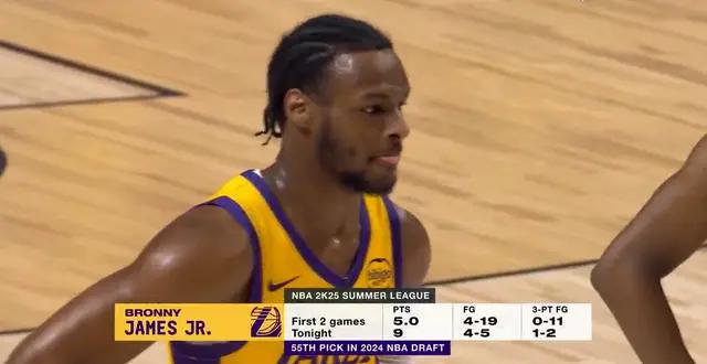 布朗尼是今年的55号秀,因为父亲詹姆斯的缘故,布朗尼在进入联盟后备受关注,不过他的表现非常糟糕,前4场比赛,布朗尼场均得到4.3分3.8篮板1.5助攻1.8失误1.3抢断,总计31中7,命中率是22.6%,三分15次出手全部偏出。