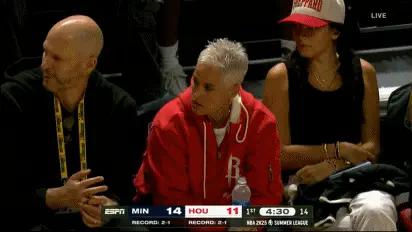 直播吧07月19日讯 NBA夏季联赛,火箭vs森林狼,谢泼德的女友Brailey Dizney坐在他父母身旁观战。