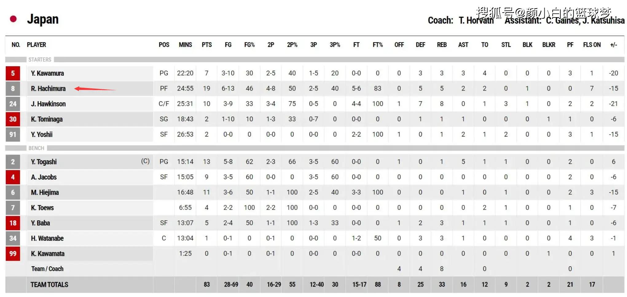 八村垒全场比赛25分钟,13中6,三分5中2,拿到19分5篮板2助攻,命中率46.1%,三分命中率40%已经是日本发挥最好的球员。渡边只有7分3篮板3助攻4失误进账。