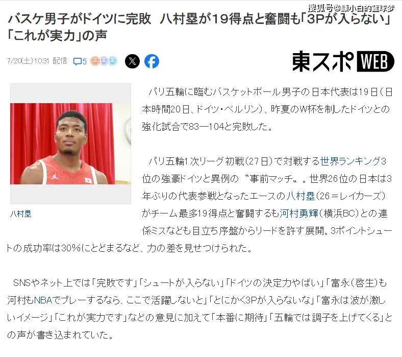 赛后日本媒体《THE ANSWER》撰文——德国22岁超级巨星太特别,他一人拿下27分8篮板击溃日本队,就是防不住。文中写道:身高2.08米的弗朗茨-瓦格纳先发登场,仅仅打了20分12秒拿到27分8篮板,日本全队都限制不了他,他有着中锋的尺寸后卫的技术,锋线的冲击力,他实在是太特别,日本无法阻止一场惨败。