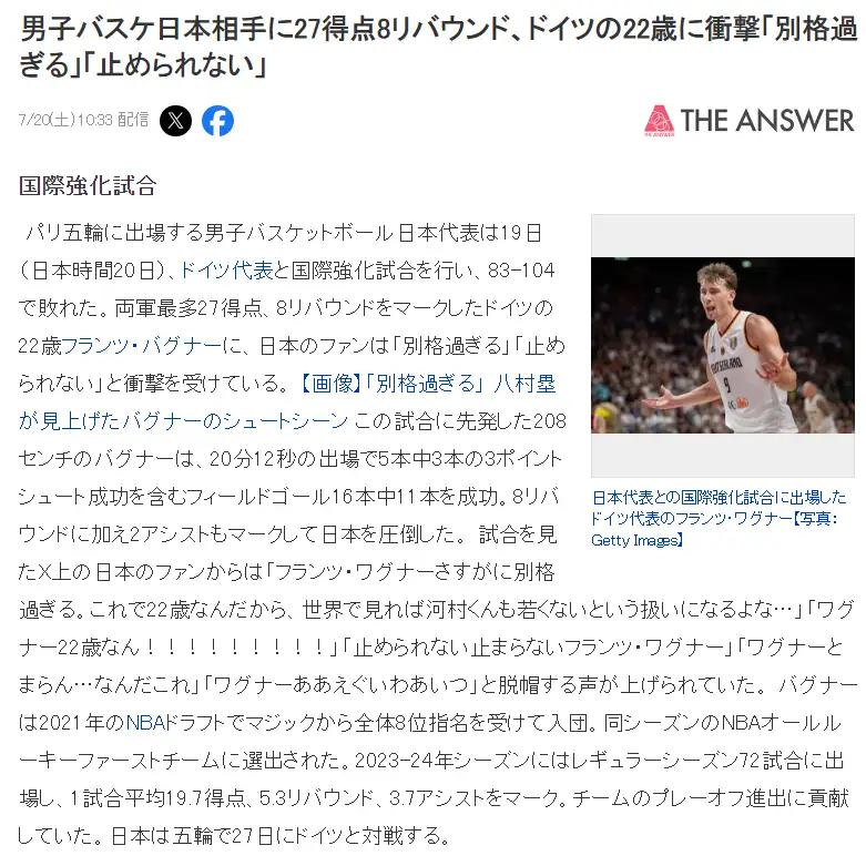 赛后日本媒体《THE ANSWER》撰文——德国22岁超级巨星太特别,他一人拿下27分8篮板击溃日本队,就是防不住。文中写道:身高2.08米的弗朗茨-瓦格纳先发登场,仅仅打了20分12秒拿到27分8篮板,日本全队都限制不了他,他有着中锋的尺寸后卫的技术,锋线的冲击力,他实在是太特别,日本无法阻止一场惨败。