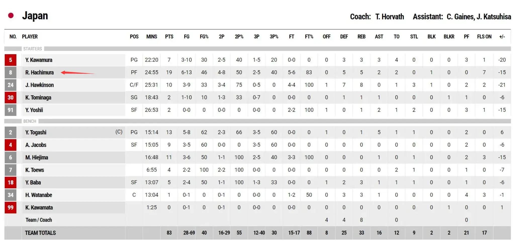 八村垒全场比赛25分钟,13中6,三分5中2,拿到19分5篮板2助攻,命中率46.1%,三分命中率40%已经是日本发挥最好的球员。渡边只有7分3篮板3助攻4失误进账。