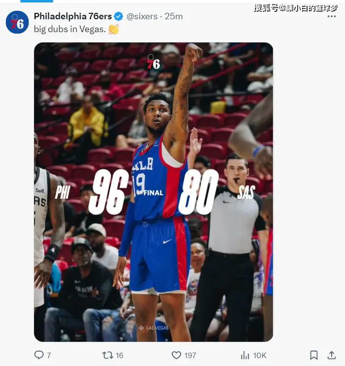 北京时间7月20日,拉斯维加斯夏联,费城76人96-80大胜圣安东尼奥马刺,四场比赛费城3胜1负还存在理论上的可能性进入夏联季后赛。此役是一场毫无悬念的比赛费城首节就领先13分,半场打完还领先5分,第三节打完还领先1分,末节直接一波32-17打崩马刺。