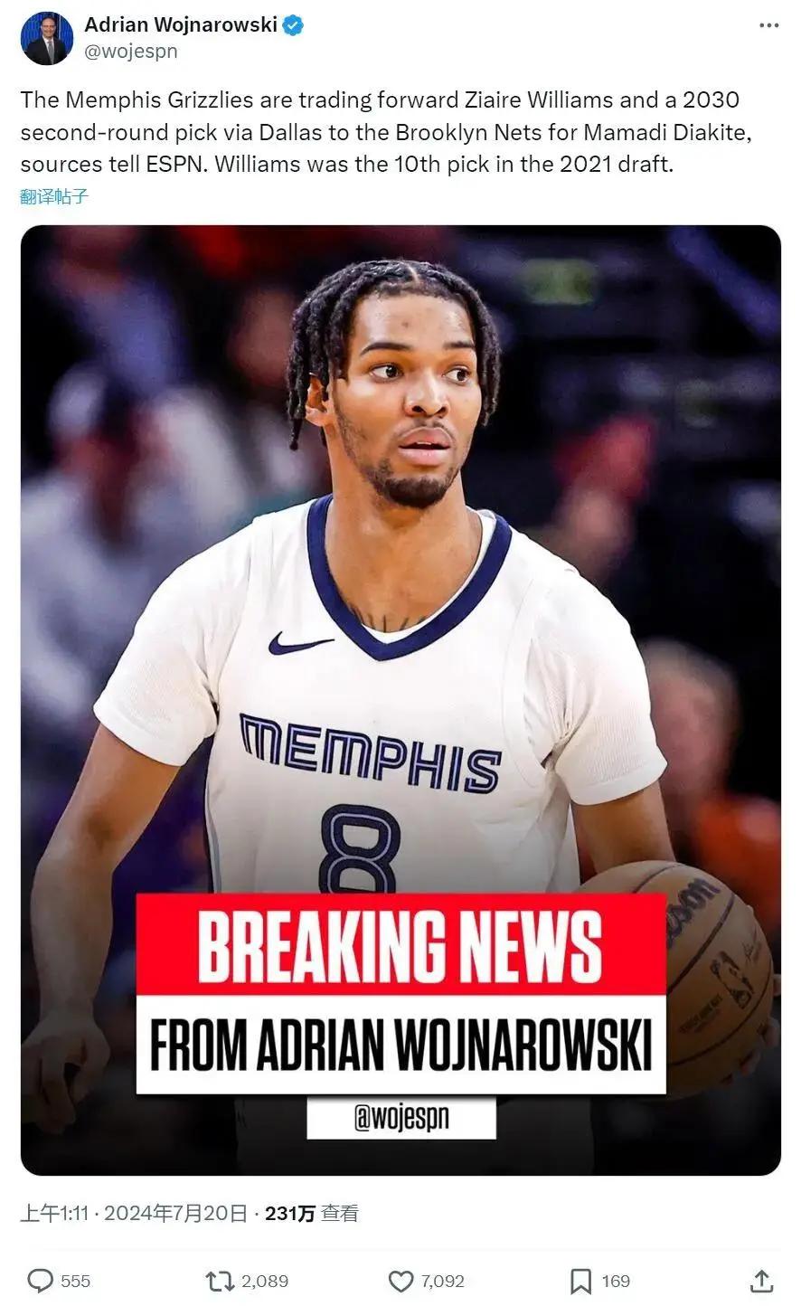 北京时间7月20日,据ESPN名记Woj报道,灰熊和篮网达成一笔2换1的交易:灰熊将扎伊尔-威廉姆斯和1个2023年的次轮签送去篮网,交易得到迪亚基特。灰熊此举是为了摆脱扎伊尔下赛季610万的合同,为续约肯纳德腾出空间。