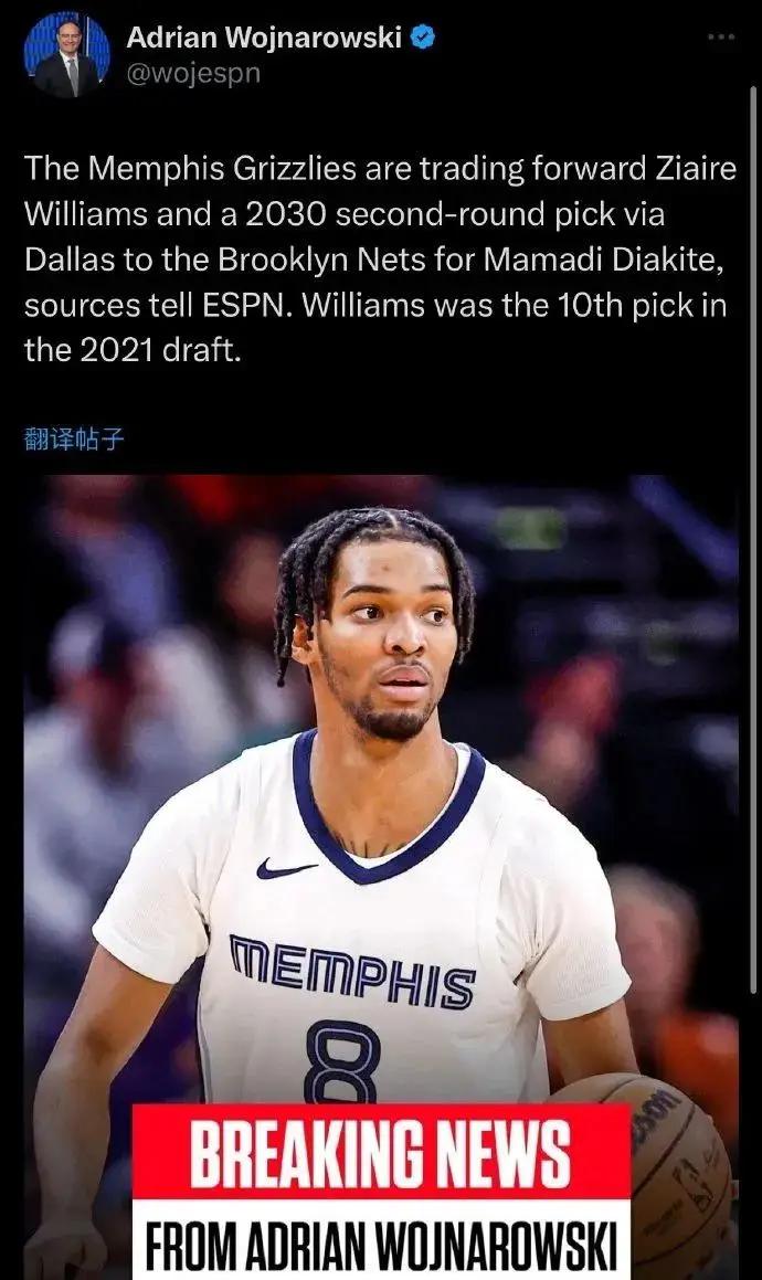 今天一大早,消息人士透露,灰熊将扎伊尔-威廉姆斯和2030年二轮签(来自独行侠)交易给篮网,换来马马迪-迪亚基特