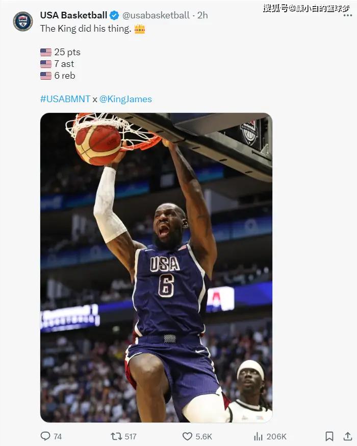 全场比赛勒布朗23分钟,14中10,三分3中2,拿到25分6篮板6助攻,命中率71.74%,三分命中率66.7%,美国男篮官方写道:国王完成了使命。