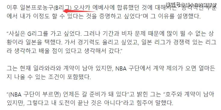 他还表示接下来自己会前往日本B联赛大板七福神队继续提升自己的进攻水准,选择日本B联赛的原因是这里竞争激烈、对抗强、技战术出众,自己应该继续在海外打拼而不是回韩国这个舒适区,自己本想继续留在G联赛打球,但因为签证与合同细节的问题没有留下来。