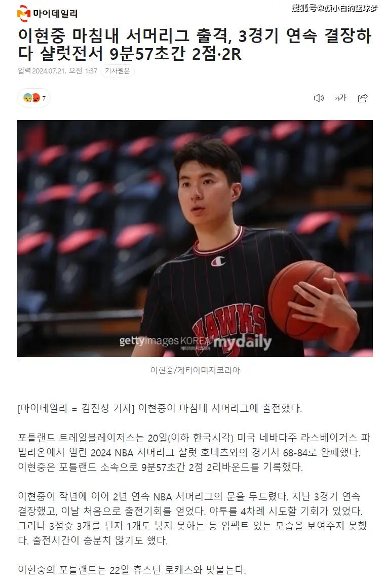北京时间7月21日,韩国媒体依旧对李贤重的登场时间感到不满,他们写道李贤重连续被弃用三场终于获得9分57秒的登场时间,但并没有什么太多的表现机会,4投1中,三个3分都没进,他的战术地位过低。