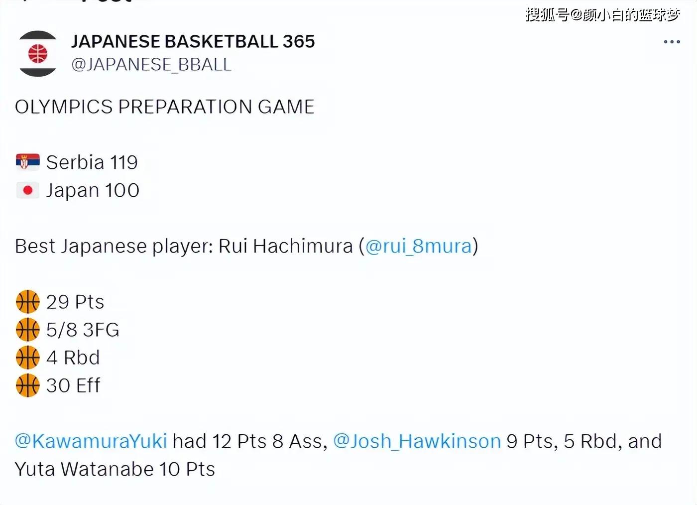 北京时间7月22日凌晨,日本男篮100-119惨败塞尔维亚男篮吞下二连败。这场比赛塞尔维亚开场就打出10-2的攻势,虽然日本回敬了一波10-2,但塞尔维亚立马就打出了11-0再度拉开分差,两队的拉锯战塞尔维亚呈现碾压,就算是只拼进攻日本也拼不过塞尔维亚。