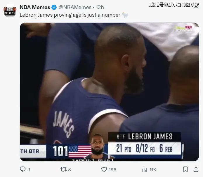 赛后美媒NBA Memes写道:看了勒布朗才知道年龄可以只是一堆数字而已,他就是GOAT。