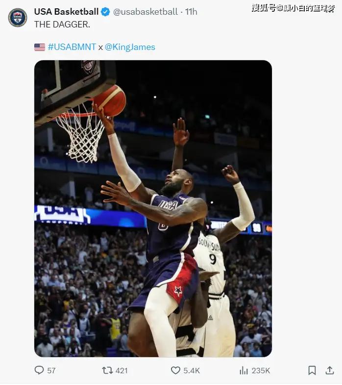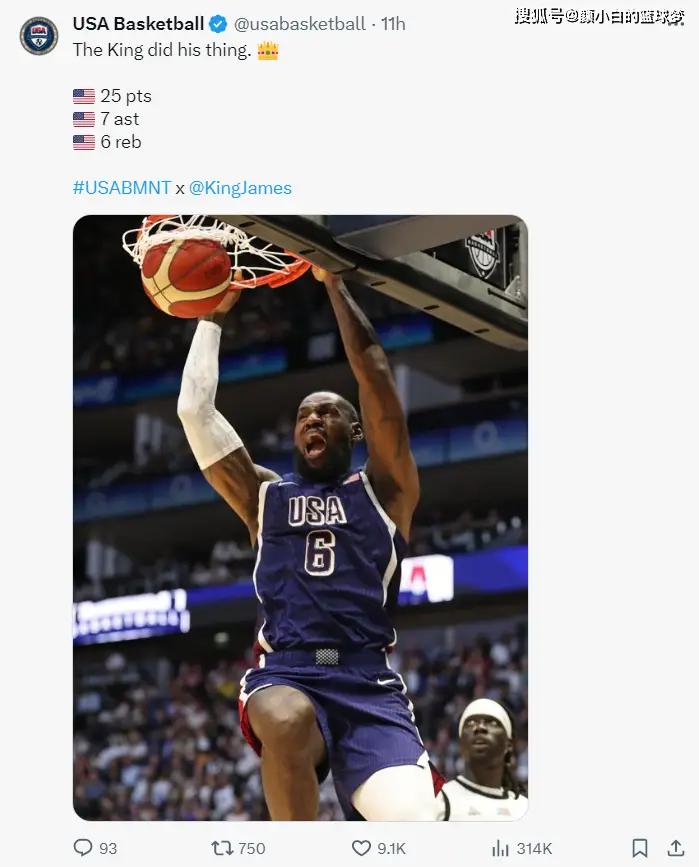 美国男篮101-100逆转南苏丹完成4连胜,这场大战美国队一度落后14分,然而这是为勒布朗搭了一个更大的舞台,终场前14秒他弧顶持球待时而动,连续胯下运球晃动对手重心后突破完成准绝杀,南苏丹还剩8秒琼斯反绝杀不中。