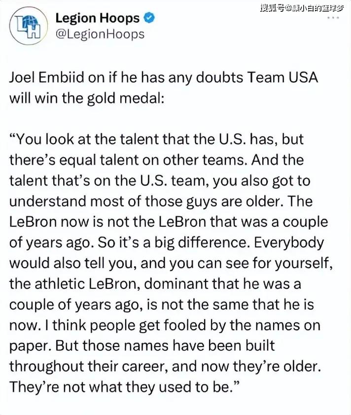 赛前恩比德接受采访时这样说道:“詹姆斯、杜兰特、库里都已经不再是巅峰时的他们,我觉得人们被纸面上的名字给骗了。但这些名字是在他们的生涯历程中建立起来的,现在他们变老了,所以美国队夺金不是必然事件。”