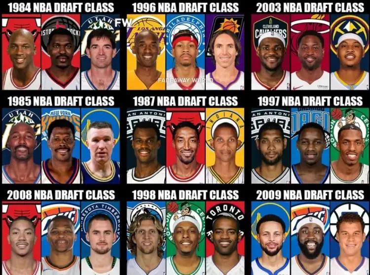 1、1984届:乔丹(探花秀)、奥拉朱旺(状元秀)、约翰-斯托克顿(首轮16号秀)