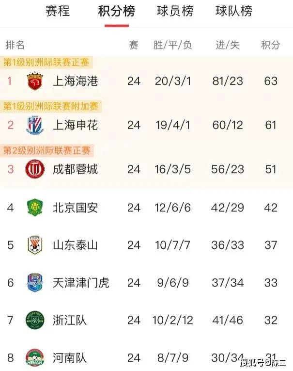 鉴于中超第二十四轮的比赛已预先进行,我们现在所看到的积分榜,实际上是中超前二十四轮的最新积分榜。