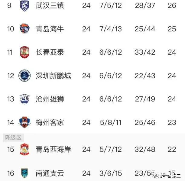 接下来,我们来详细分析一下联赛第十名至第十六名的积分状况:正如之前提到的,青岛海牛目前积25分,与之并列的共有三支队伍,分别是深圳、沧州以及长春;而梅州客家则以23分位居第十四名。